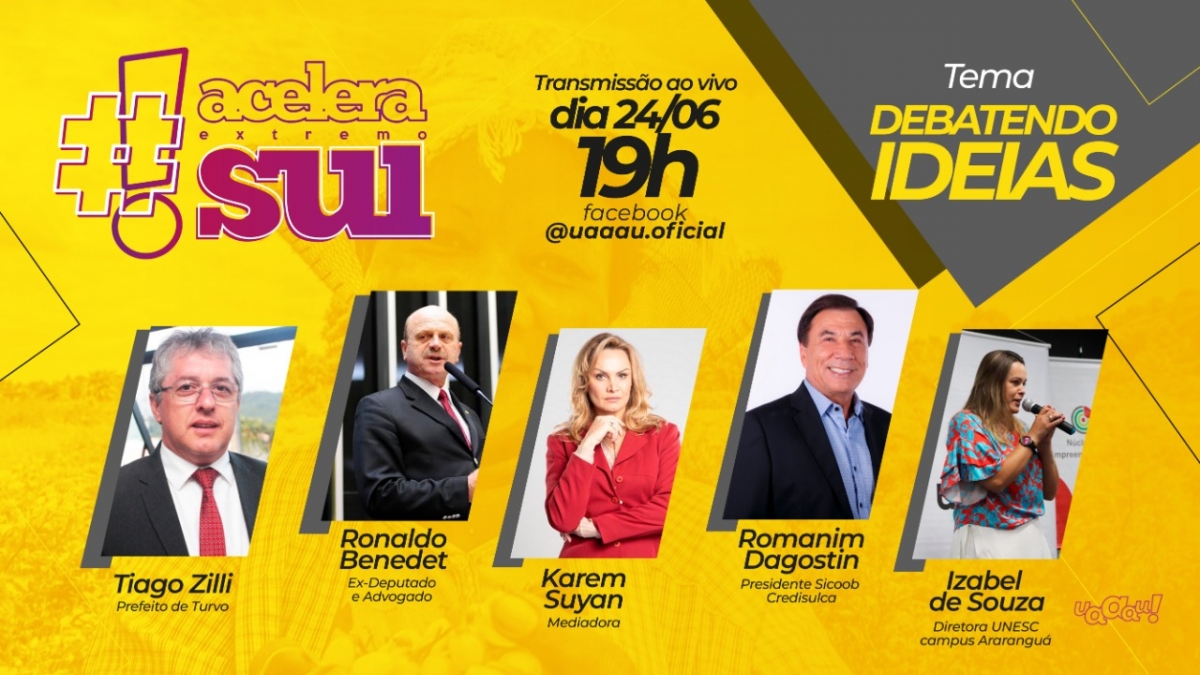 Está marcada para quarta-feira, dia 24, a primeira live ‘Debatendo Ideias” do Projeto Acelera Extremo Sul, que visa motivar a retomada da cadeia econômica na região e superar os impactos impostos pela pandemia do novo coronavírus.