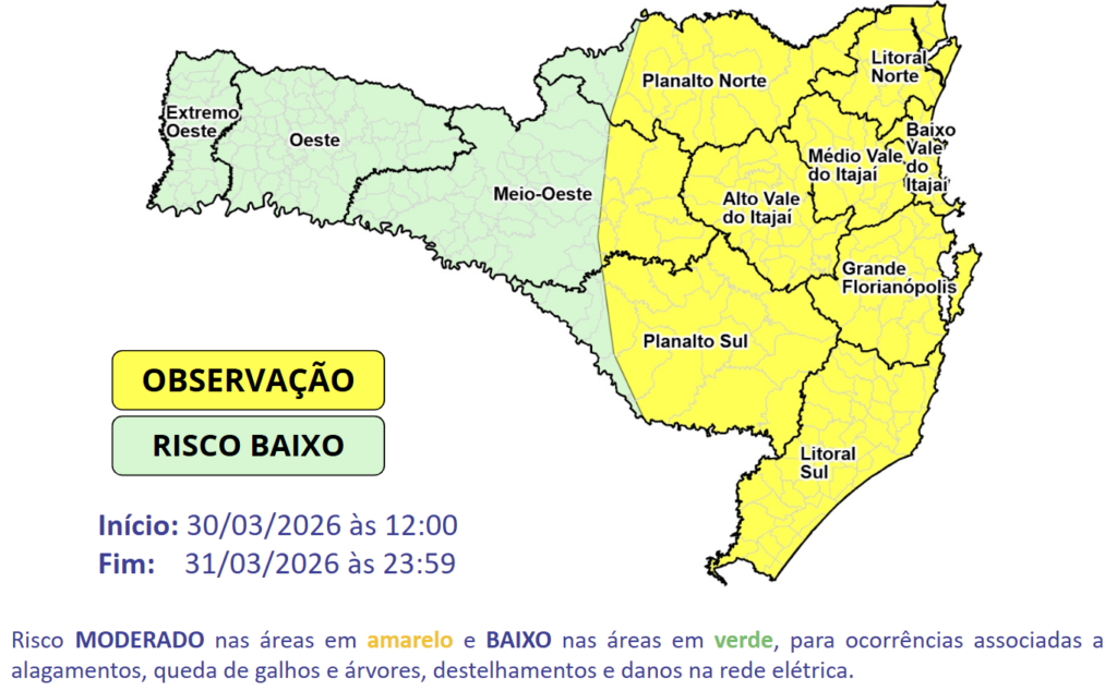 O vento sopra com fraca intensidade e sem direção predominante. Nas próximas horas, o tempo segue com variação de nuvens no Litoral e Vale do Itajaí, já a partir da tarde, o aumento das temperaturas favorece a formação de temporais isolados entre os Planaltos e o Litoral. Com risco baixo a moderado para ocorrências relacionadas aos temporais.