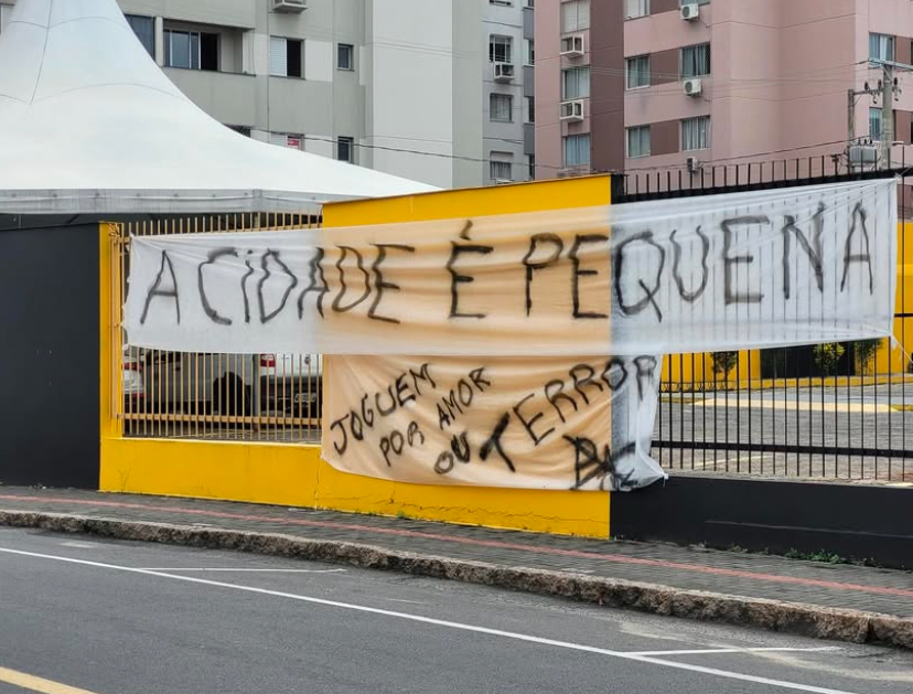 Na manhã deste sábado, o Estádio Heriberto Hülse amanheceu com manifestações de torcedores do Criciúma. Faixas foram penduradas no local com críticas ao desempenho recente da equipe e pedidos por alterações no modelo de jogo adotado por Eduardo Baptista. Expressões como “Chega de improvisação”, “4-4-2” e “A cidade é pequena” chamaram atenção.