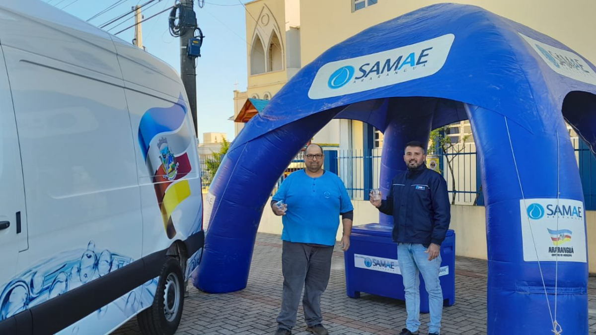 Nesta sexta-feira, desde cedo, a autarquia distribui copos de água e também divulga seus projetos, em especial sobre captação e fornecimento de água, tratamento de esgoto e SAMAE na Escola.