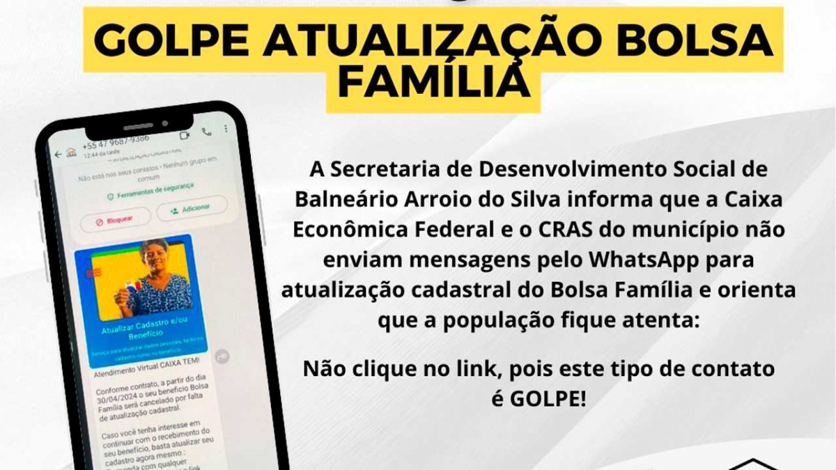 A Secretaria Municipal de Desenvolvimento Social de Balneário Arroio do Silva alerta a população a respeito de mensagens falsas via whatsapp a respeito de atualização cadastral do bolsa família.