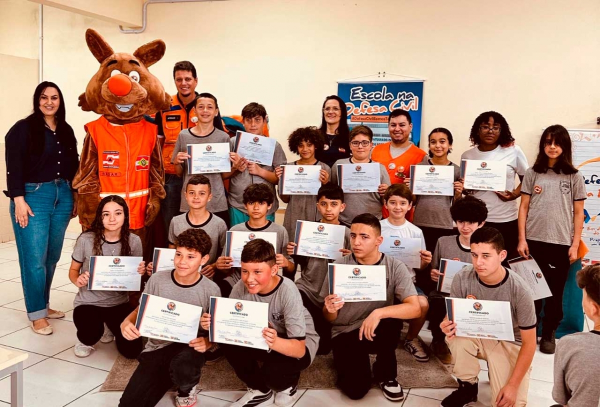 A cerimônia contou com a presença do coordenador municipal da Defesa Civil, Afrânio Ronconi, da diretora Vilma, do professor de Geografia Aldy, além do apoio da pedagoga Vanessa Zeferino.
