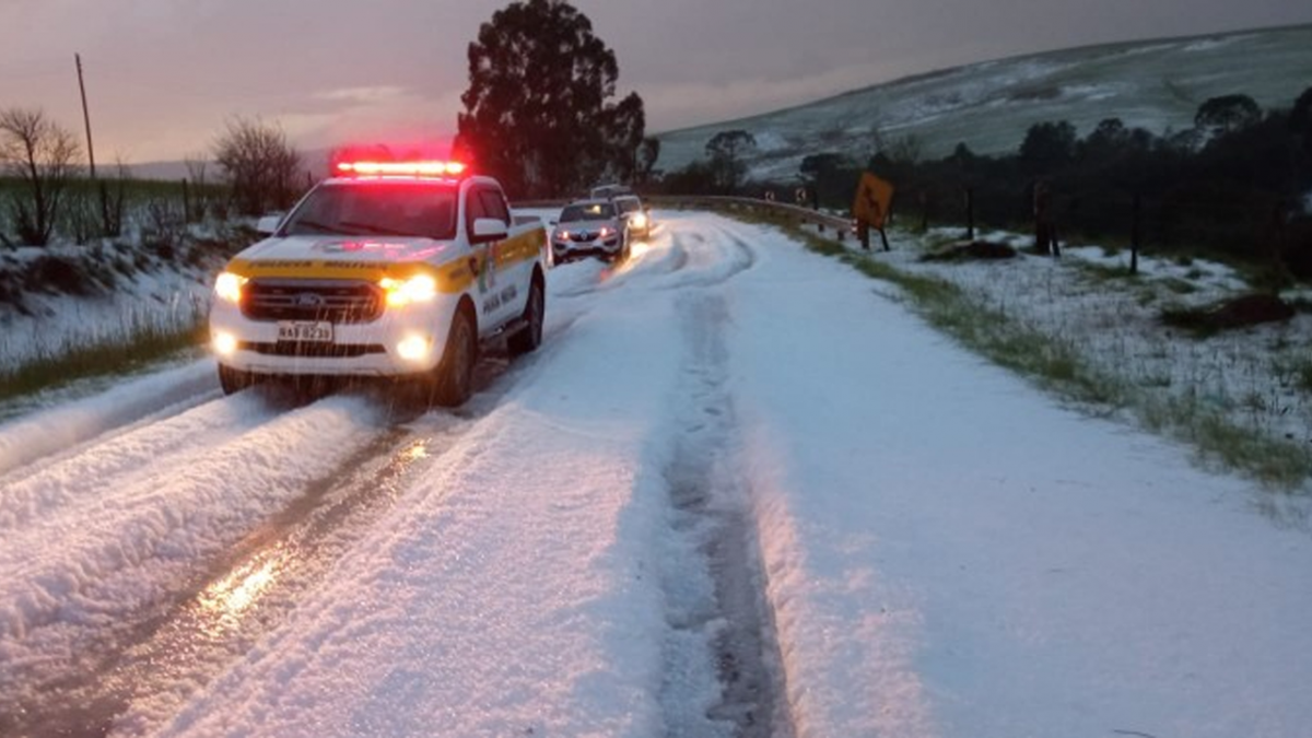 Segundo informações do Posto 3 da Polícia Militar Rodoviária (PMRv), localizado em Lebon Régis, a pista ficou obstruída nos dois sentidos e não houve acidentes. “O pessoal estava bem consciente, só não conseguia trafegar. Em alguns locais de sombra ainda tem um pouco de gelo, mas não tem mais obstruções”, informou a PMRv. Abaixo, confira imagens: