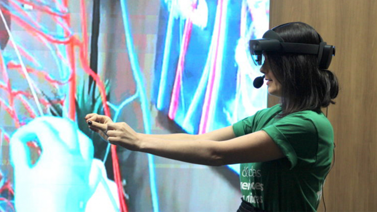 É por meio da aula de meta-anatomia que o virtual e o real se conectam. Com o uso do dispositivo de realidade virtual é possível ter uma experiência tridimensional imersiva. Isso quer dizer que tanto professores quanto acadêmicos conseguem “entrar” dentro do corpo humano e explorar 11 sistemas, como o cardiovascular, neurológico, esquelético, entre outros.