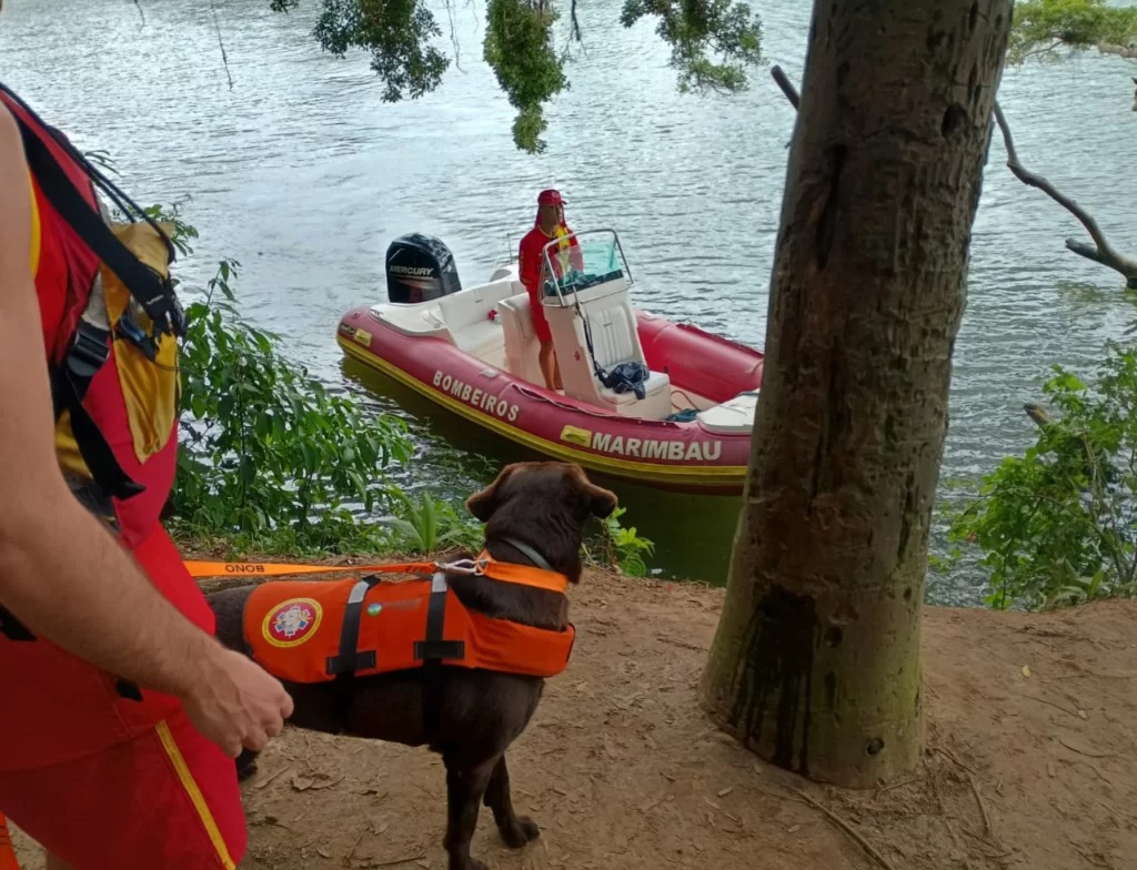O cão Bono, conduzido pelo sargento Premoli, é treinado para realizar varredura por odor, ajudando a identificar locais com maior probabilidade de localização da vítima e orientando os mergulhadores nos pontos de busca subaquática.