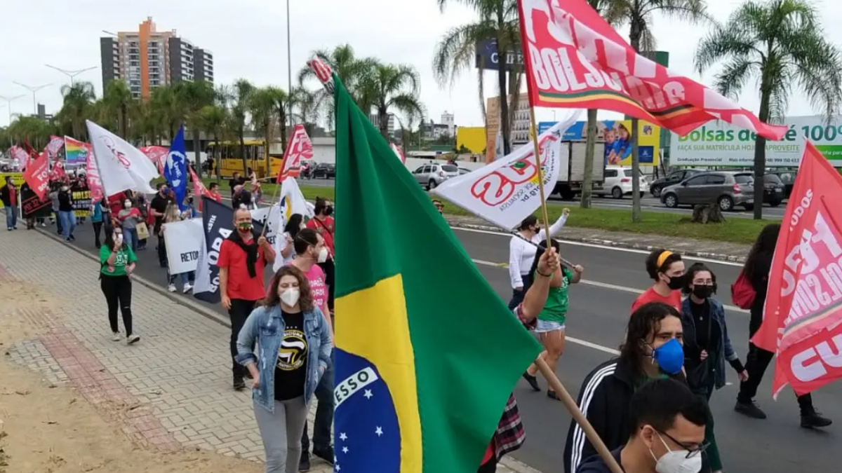 Cidades de Santa Catarina registraram protestos contra o presidente Jair Bolsonaro neste sábado (2). Organizados por centrais sindicais, partidos políticos de esquerda e movimentos sociais que compõem a Frente Fora Bolsonaro, os atos foram divididos por regiões do Estado. A maioria ocorreu pela manhã. Na capital, Florianópolis, a manifestação estava marcada para a tarde, mas foi cancelada por conta do mau tempo.