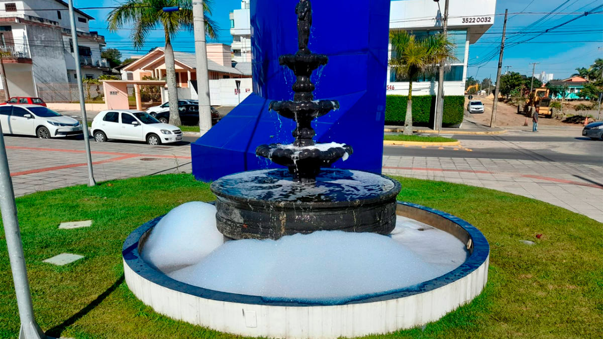 O chafariz, que fica situado na Praça das Águas – na esquina das avenidas Coronel João Fernandes e Capitão Pedro Fernandes, em Araranguá – amanheceu coberto por uma espuma branca na manhã desta quinta-feira, dia 21. A suspeita é que vândalos tenham jogado sabão em pó ou detergente na água. Populares e moradores surpreenderam-se com a situação.