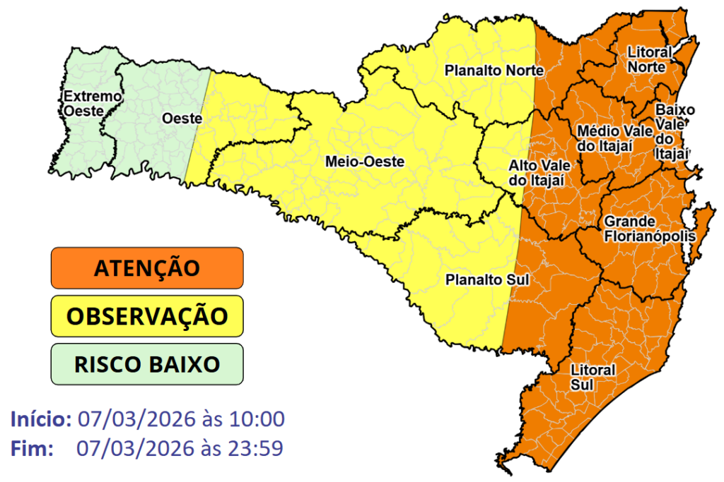 O destaque fica para as regiões litorâneas, especialmente nas áreas costeiras em todo o litoral, abrangendo o Litoral Sul, Grande Florianópolis, Vale do Itajaí e o Litoral Norte, onde os temporais podem ser mais intensos e acompanhados de rajadas de vento e granizo, além de chuva intensa em curto período de tempo. Nessas áreas, o risco é moderado a alto para danos relacionados a rajadas de vento e granizo, como queda de árvores, destelhamentos e interrupções no fornecimento de energia elétrica, além de alagamentos e enxurradas pontuais.