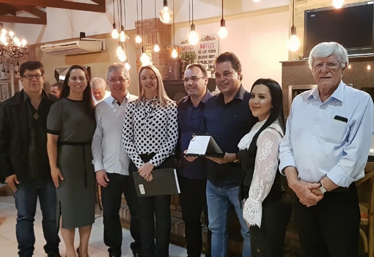 Durante sua visita no Clube Alvorada, Rodrigo Minotto foi homenageado pela Escola de Educação Básica João Colodel pelos relevantes serviços prestados a educação no Estado. Entre suas grandes ações, Minotto foi o mentor e defensor do Artigo 170 e tem grande respeito e admiração por alunos e universitários. Na foto, Minotto ao lado da assessora de direção da escola, Daiane Rezzin e o diretor geral, José Pedro Idalino.