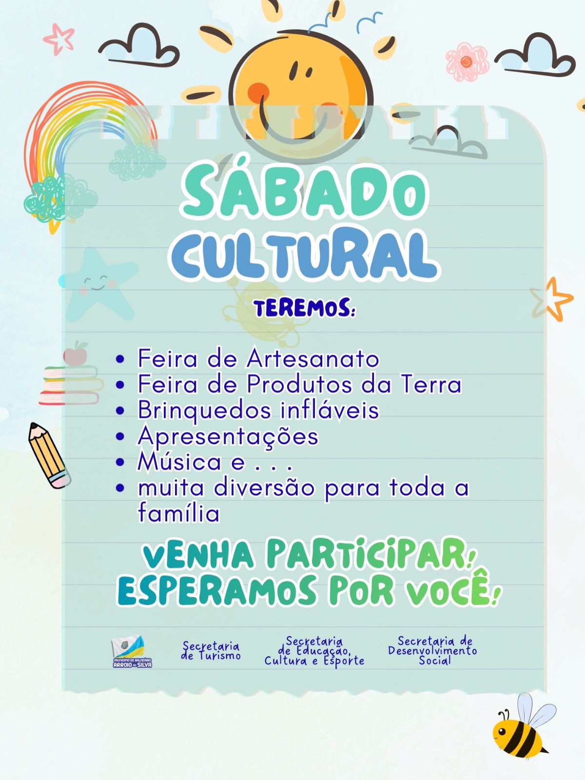 A Prefeitura de Balneário Arroio do Silva convida a população para participar do 1º Sábado Cultural de 2026. Será uma tarde especial de cultura, lazer e integração para toda a família, com diversas atrações para a comunidade. O evento acontece no próximo sábado, dia 21 de março, das 13h às 17h na Praça Central. Haverá atividades como Feira de Artesanato, Feira de Produtos da Terra, brinquedos infláveis, música e apresentações culturais.