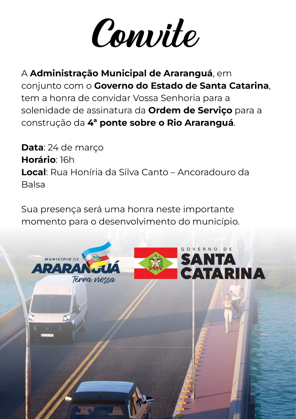 O Governo de Santa Catarina assina nesta terça-feira (24), às 16h, a ordem de serviço para duas obras importantes para o Extremo Sul catarinense: a construção da quarta ponte sobre o Rio Araranguá, conhecida como Ponte de Ilhas, e a implantação de uma ciclovia na SC-447, ligando Araranguá ao Balneário Arroio do Silva.