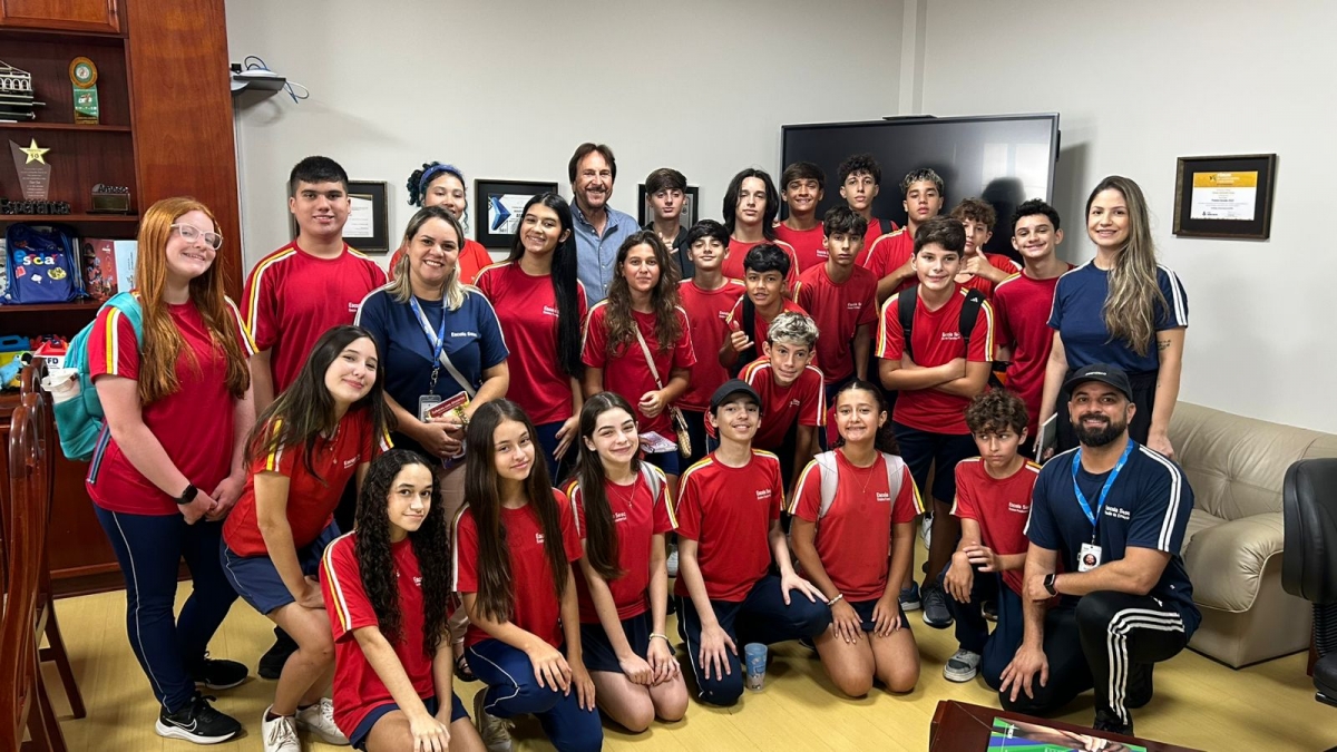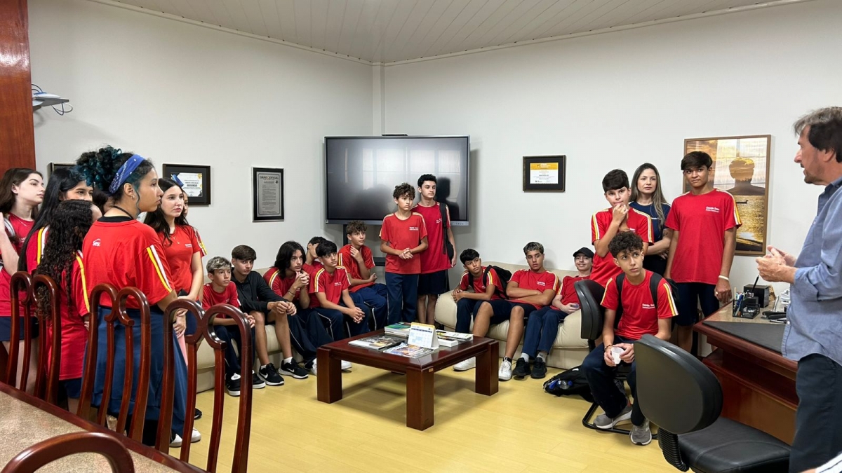 Durante a visita, os estudantes tiveram a oportunidade de conversar com o prefeito, entender alguns setores da Prefeitura e aprender mais sobre o papel do poder público na organização e no desenvolvimento da cidade.