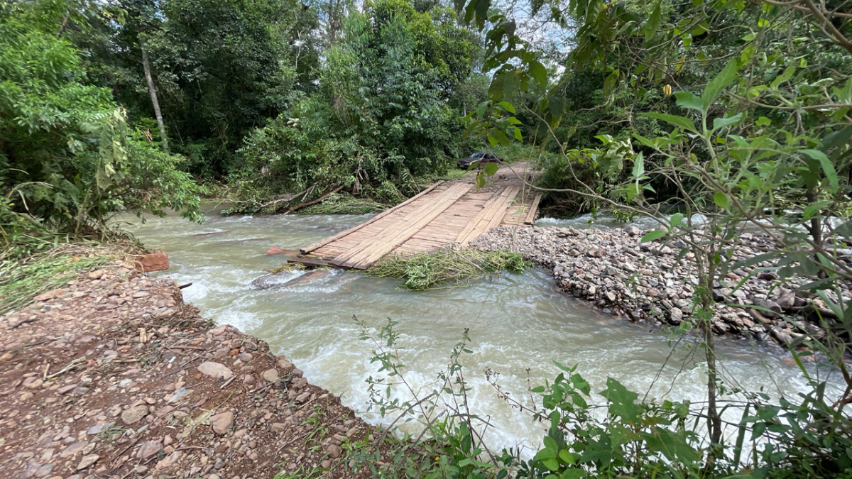 Uma ponte de madeira teve sua cabeceira destruída, enquanto o rio saiu do seu leito em outro ponto.