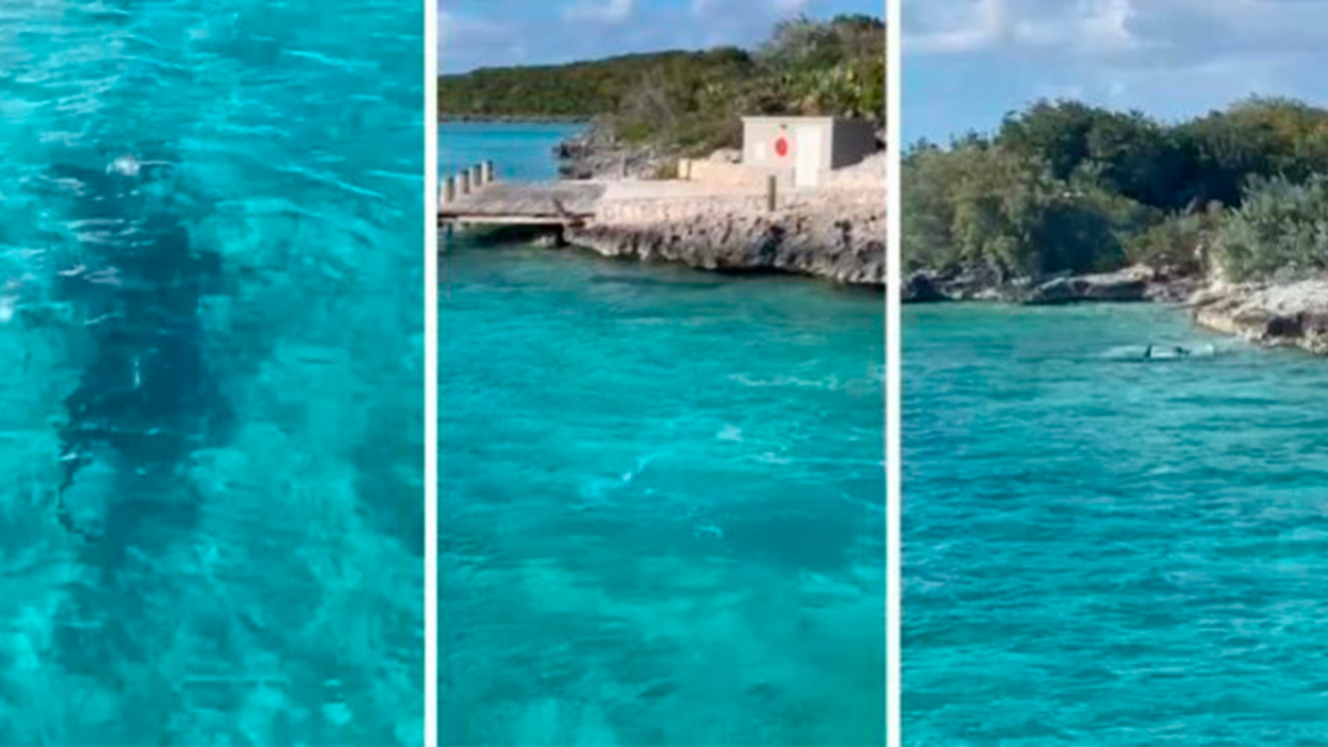 Turistas que visitavam as Bahamas ficaram assustados quando o animal doméstico afugentou o predador marinho com mordidas.