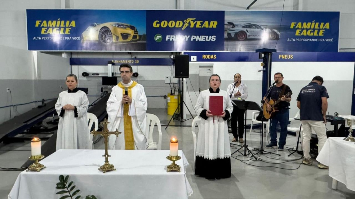 Nesta semana, a celebração foi realizada na quarta-feira (25), às 19h30, na empresa Fredy Pneus. A missa reuniu colaboradores, familiares e fiéis.