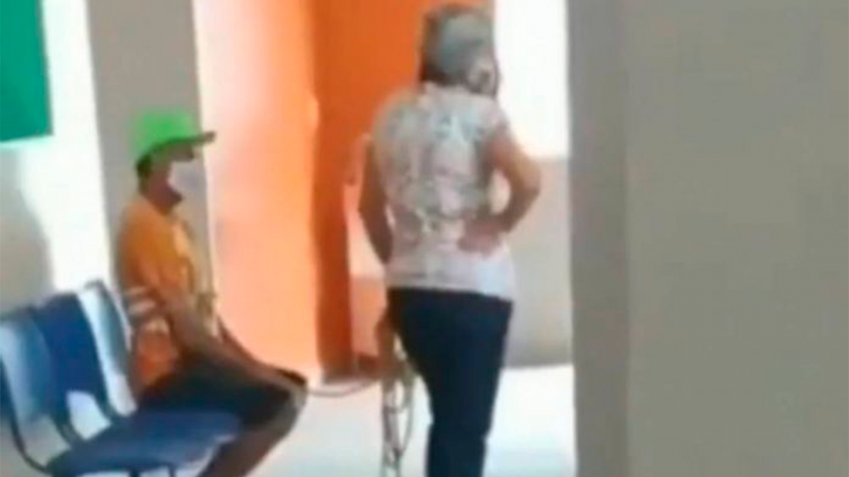 No registro, flagrado por uma pessoa que estava presente no local, o homem aparece sentado nas cadeiras do ambiente, com o corpo amarrado em uma corda, que era segurada por uma mulher em pé.