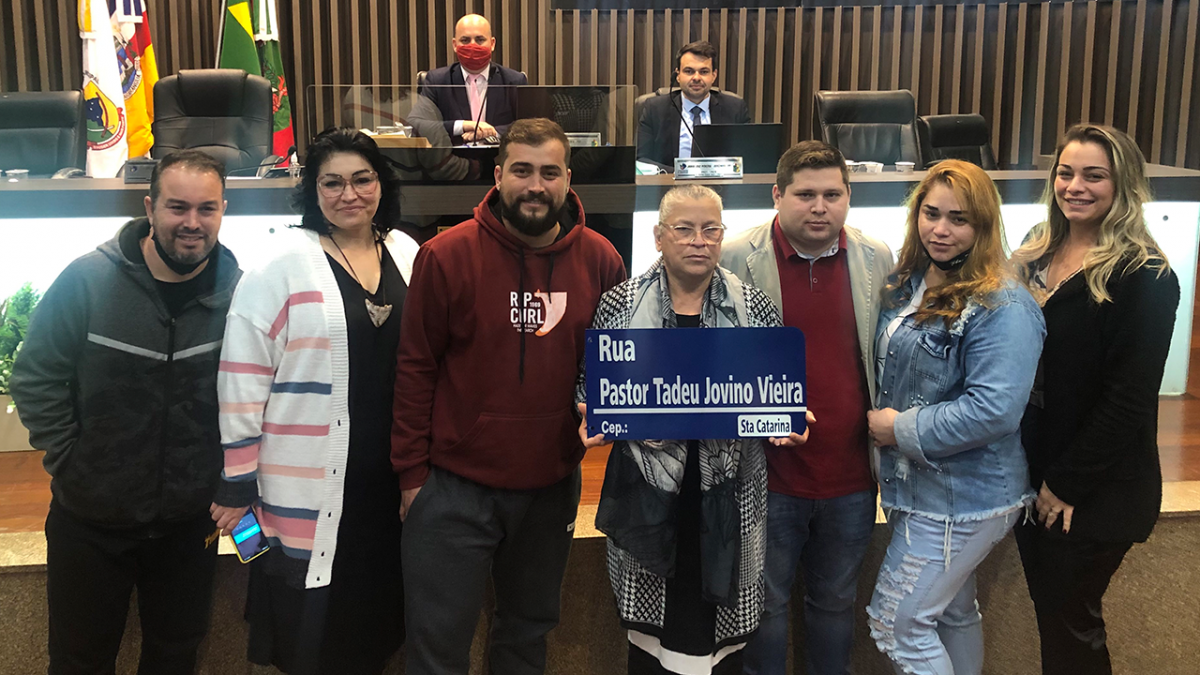 O vereador Luís Henrique Monteiro Ramos (Progressistas) aprovou na Câmara de Vereadores o Projeto de Lei 053/2021 que nomeia Pastor Tadeu Jovino Vieira a atual Rua 01, situada no loteamento Bela Vista, no bairro Santa Catarina em Araranguá. A matéria foi aprovada por unanimidade na Casa Legislativa na sessão desta quarta-feira (04) com a presença de amigos e familiares do pastor evangélico.