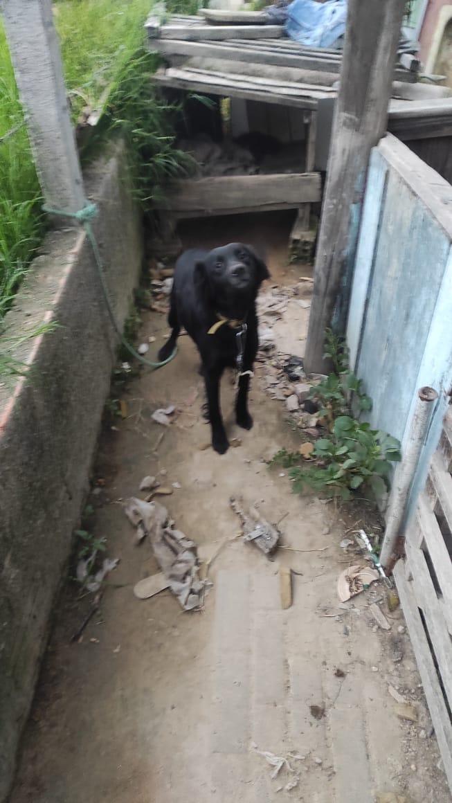 No quintal da residência, onde era usada como ponto de tráfico de drogas, havia um abrigo, bem precário e lá estava escondido um cãozinho, amarrado com uma corda no pescoço, sem água e comida.