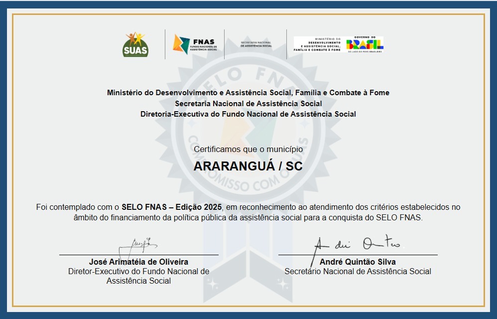 A Secretaria de Assistência Social e Habitação de Araranguá conquistou um importante reconhecimento nacional ao receber o Selo FNAS – Edição 2025, concedido pelo Ministério do Desenvolvimento e Assistência Social, Família e Combate à Fome, por meio do Fundo Nacional de Assistência Social (FNAS).