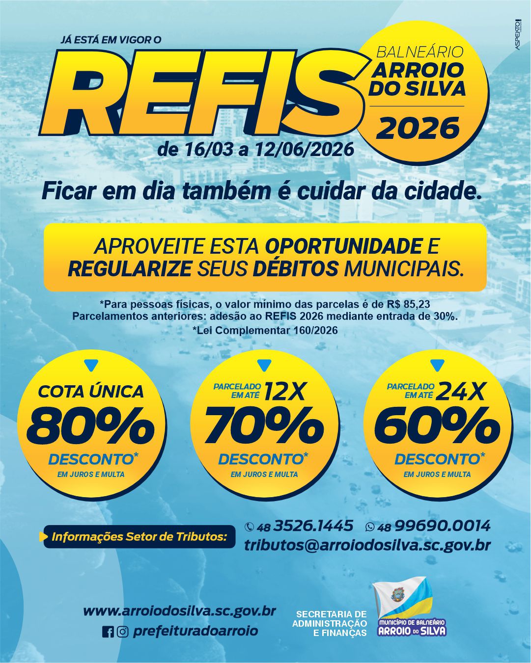 Mais informações também através do telefone: (48) 3526 1445 / WhatsApp: 48 99690-0014; e-mail: tributos@arroiodosilva.sc.gov.br