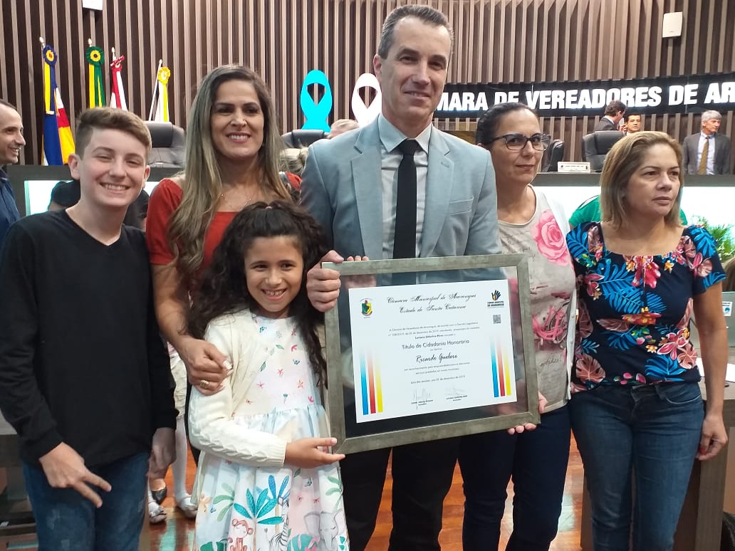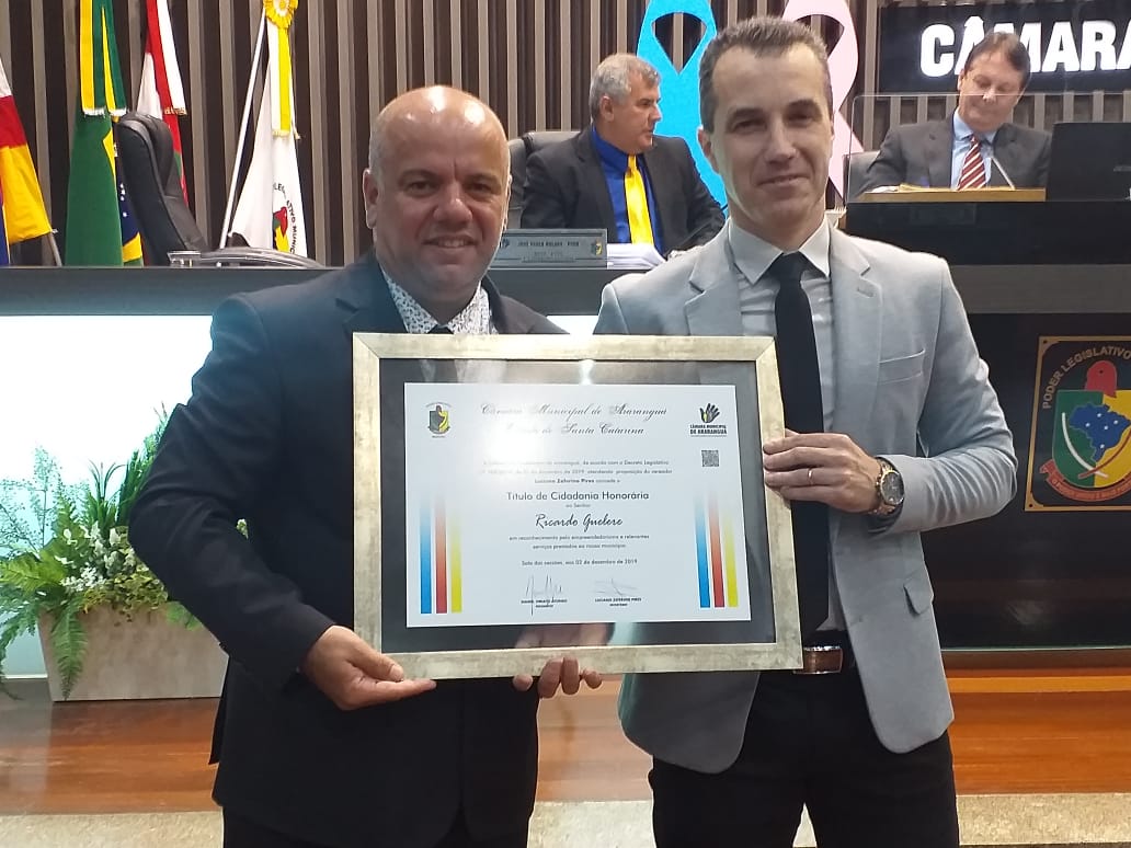 Com uma salva de palmas espontânea por parte da plateia que lotou o Plenário Autíssimo Tournier, na Câmara de Vereadores de Araranguá, o advogado e administrador de empresas, Ricardo Ghelere, recebeu na noite desta segunda-feira, 02, o Título de Cidadão Honorário Araranguaense. A preposição partiu do vereador Luciano Pires (PSB) e foi aprovada por unanimidade pelos integrantes da Casa.