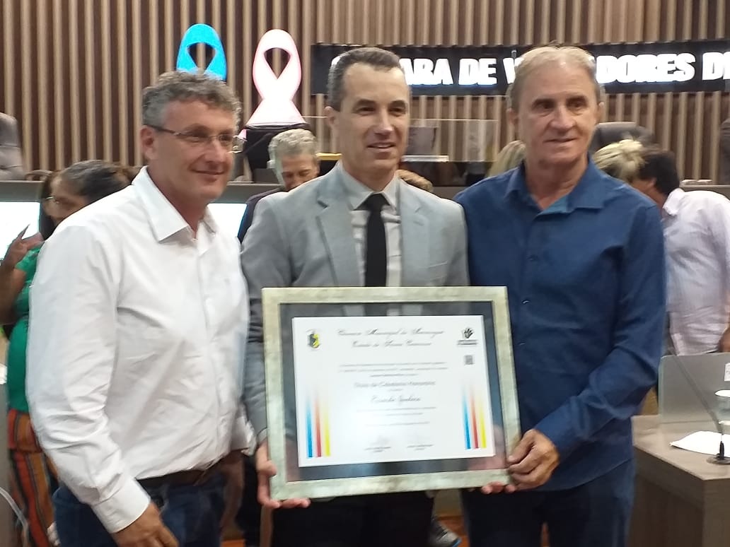 Proposta do vereador Luciano Pires (PSB) foi aprovada por unanimidade. Ghelere recebeu título com muitos aplausos