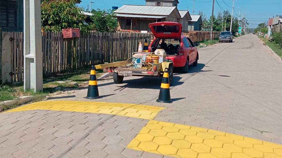 Com esse objetivo a Secretaria de Obras, após a conclusão das pavimentações de ruas, está executando a pintura das faixas de pedestres e lombadas físicas A equipe da Secretaria já sinalizou diversas ruas nos bairros Santa Fé , Jardim Ultramar e Itapuã.