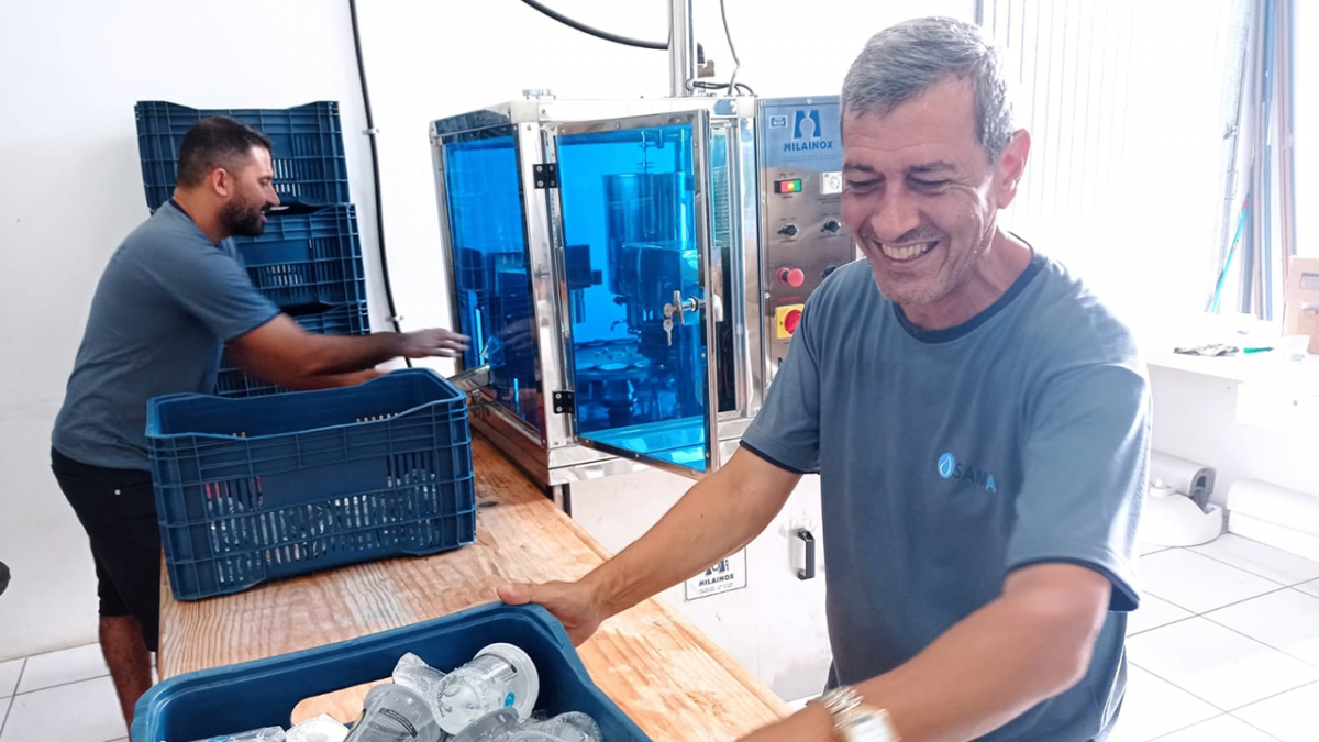 Na manhã desta sexta-feira, dia 11, os servidores do SAMAE, Paulo César dos Anjos Gomes, Paulinho e Filippe Hilário Borges trabalharam no envasamento de copos de água. Uma destas remessas, com 500 unidades, será destinada ao DME, apoiando o Torneio de Vôlei de Dupla - masculino e feminino - que será realizado neste sábado, dia 12 de março, a partir das 9h na arena implantada no Balneário Ilhas.