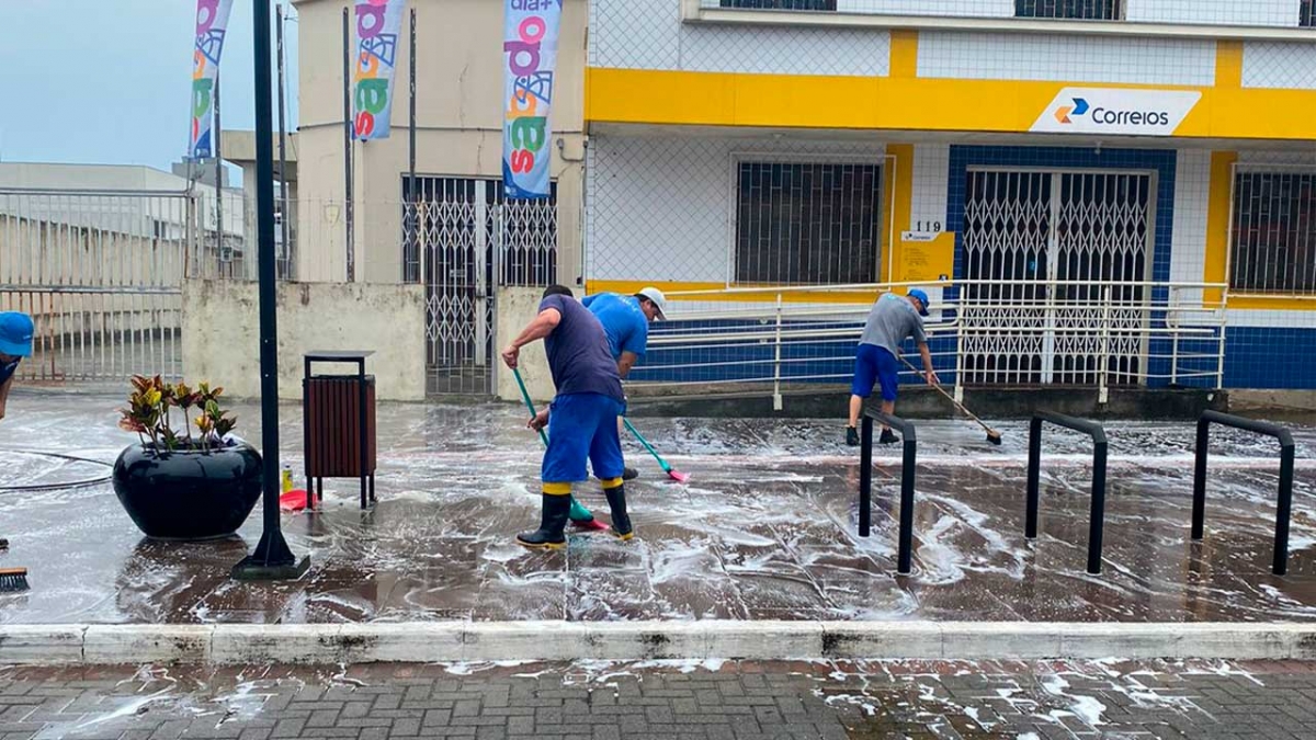 Nem a fina chuva foi empecilho para que a equipe operacional do SAMAE realizasse a limpeza do piso e das artes do calçadão neste da avenida Getúlio Vargas, neste domingo.