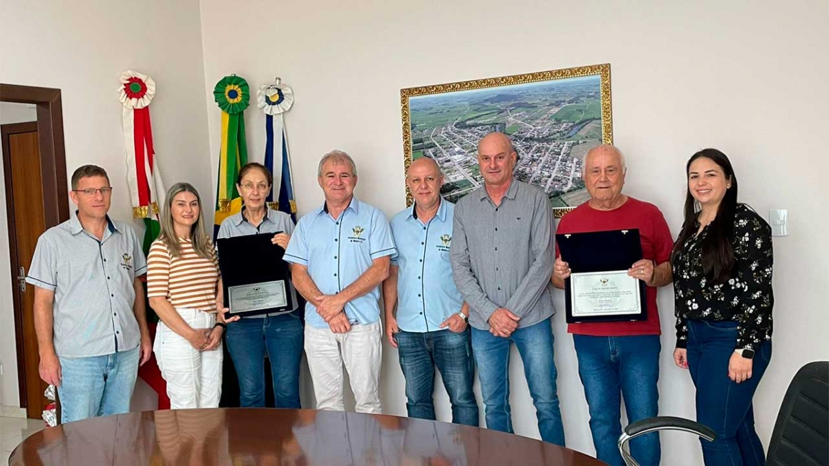 Nesta semana receberam placas de homenagem à professora e secretária executiva da Educação , Mariza Búrigo e o mais antigo servidor do município, senhor Enedir Pelegrini.