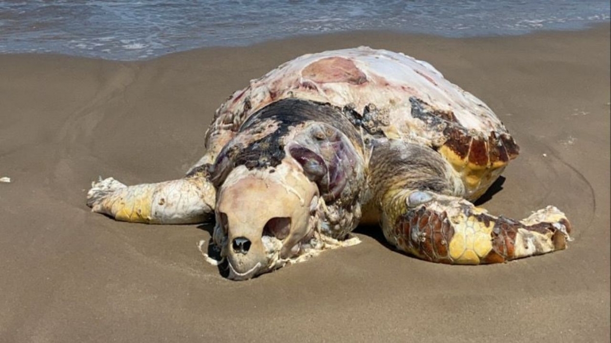 Uma moradora da praia do Morro dos Conventos em Araranguá encontrou a carcaça do que parece ser uma tartaruga centenária em frente ao hotel Morro dos Conventos.