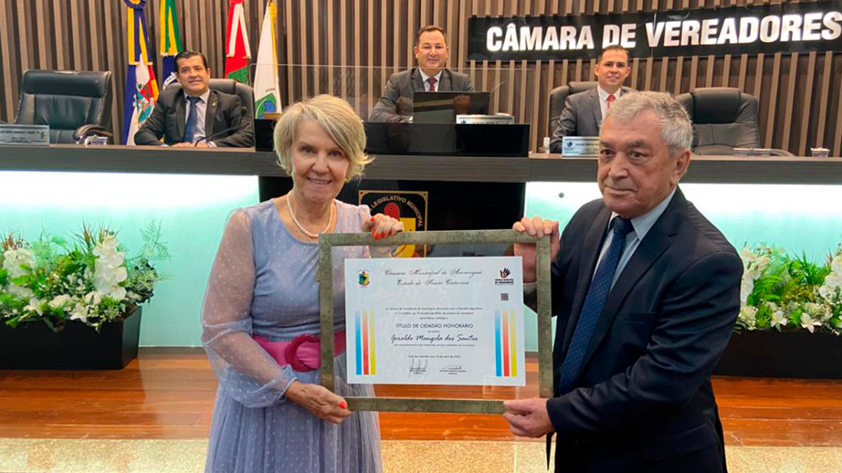 O empresário Geraldo Mangela, que completa nesta terça-feira (19) seus oitenta anos de vida, recebeu do Poder Legislativo Municipal o título de cidadão honorário de Araranguá. A sessão que aprovou o projeto de decreto legislativo aconteceu na noite desta segunda-feira (18) e foi uma proposta da vereadora Lena Périco (MDB).