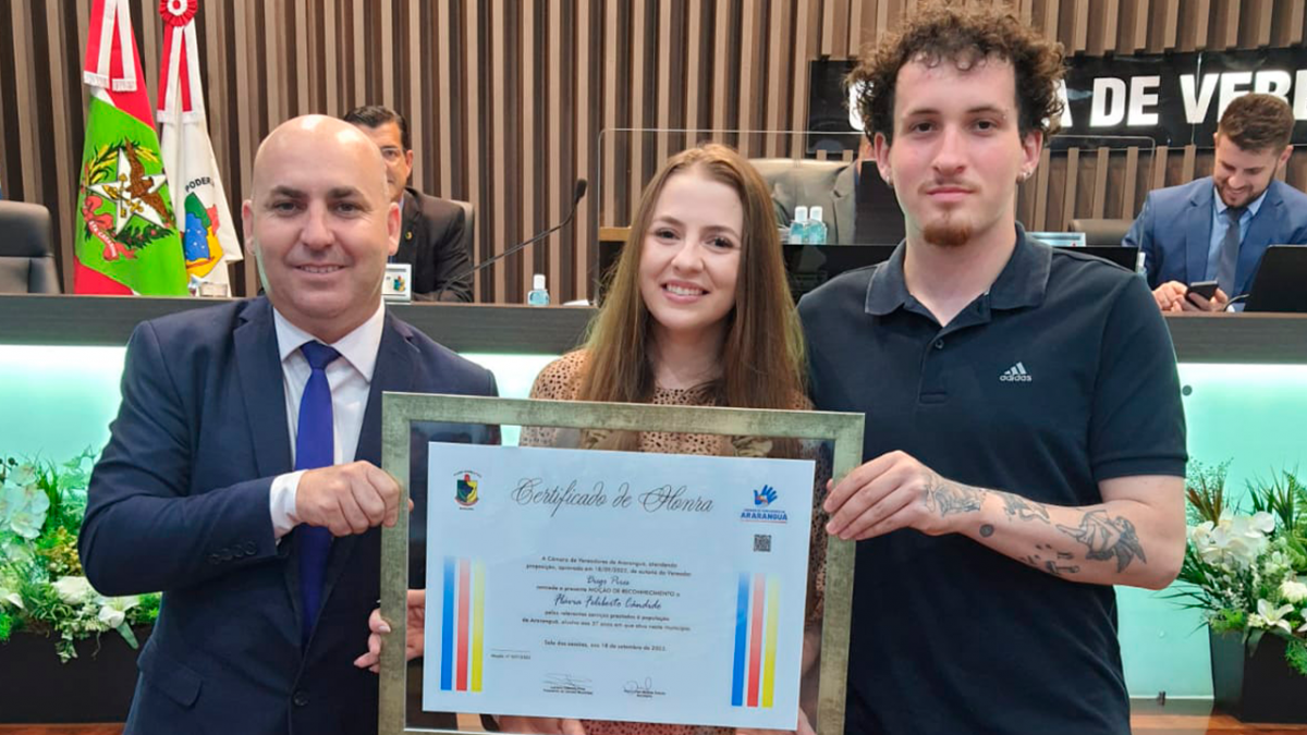 Com vasto currículo, Flávia, que atuou na secretaria de Saúde de Araranguá e na Fundação Ambiental (Fama) implementou no município diversas ações de bem-estar animal, como o projeto de castração móvel. A homenagem foi de autoria do vereador, Diego Pires, e os filhos da homenageada Renata e Gustavo receberam uma placa representando a mãe que está atualmente nos Estados Unidos.