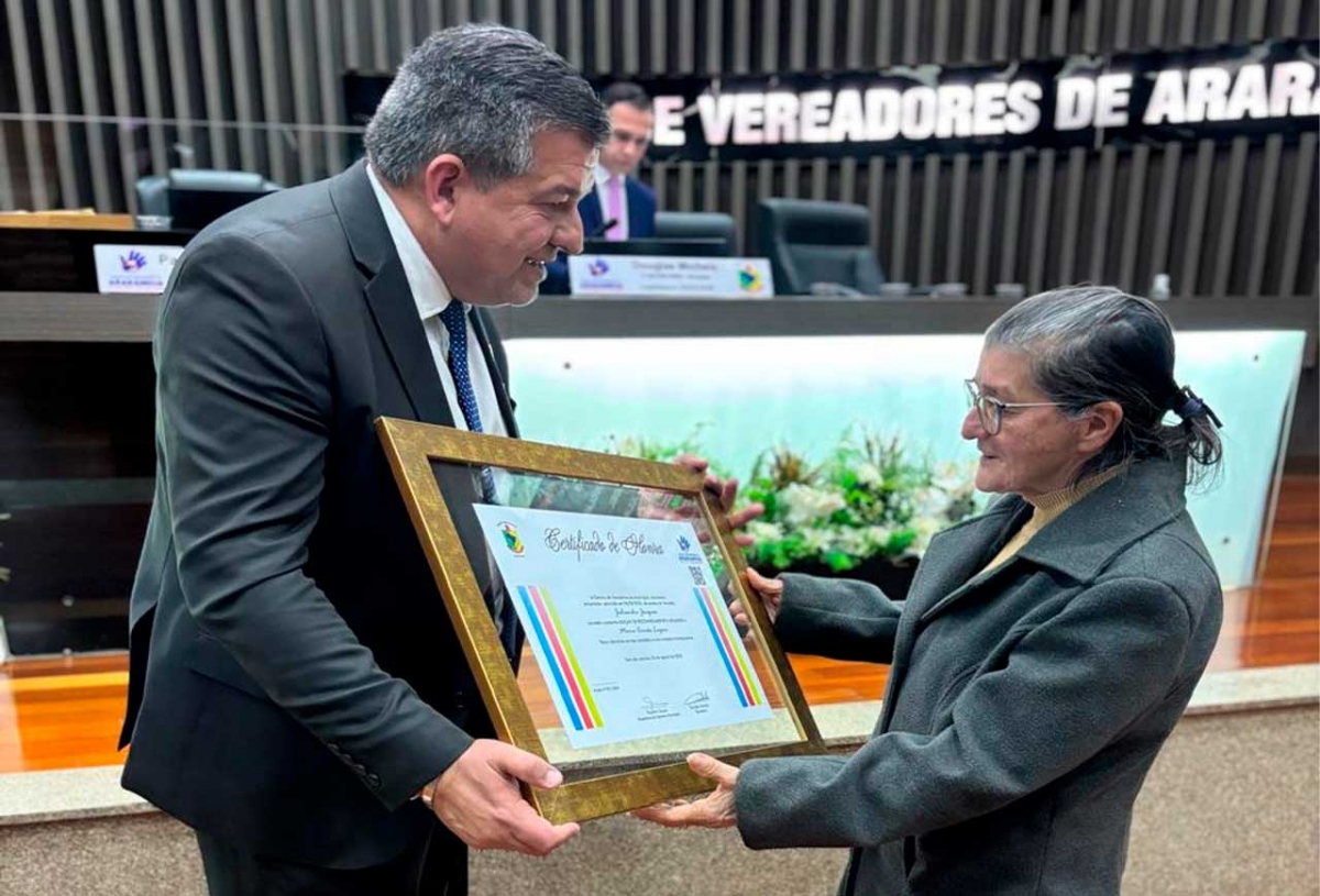 Na 38ª sessão ordinária desta quarta-feira (6), a Câmara de Vereadores de Araranguá aprovou por unanimidade a Moção de Reconhecimento e Aplausos nº 031/2025 à Maria Corrêa Lupin, a Dona Cotinha, pelos relevantes serviços prestados à comunidade e por sua trajetória de vida exemplar. A homenagem foi proposta pelo vereador e vice-presidente da Casa, Juliandro Jacques, que conduziu a entrega com emoção, destacando a importância de valorizar figuras históricas ainda em vida. "Histórias lindas como a da Dona Maria precisam ser contadas. O município recebe a senhora com carinho. Que Deus abençoe sua força, sua saúde e toda sua família", declarou.
