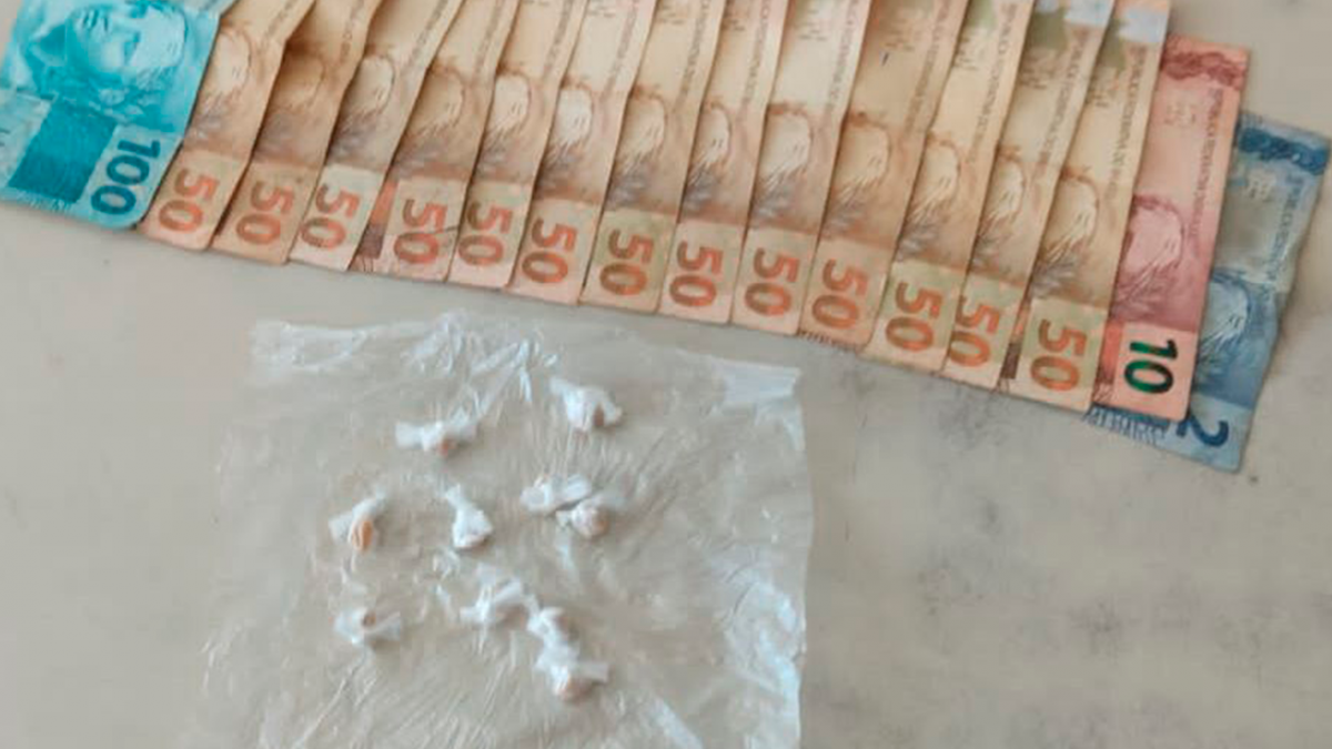 Após a abordagem, os policiais encontraram dinheiro com o rapaz, porém logo ao chão havia um plástico contendo 10 pedras de substância semelhante a crack embaladas em plástico transparente, pesando em torno de 2,6 gramas.
