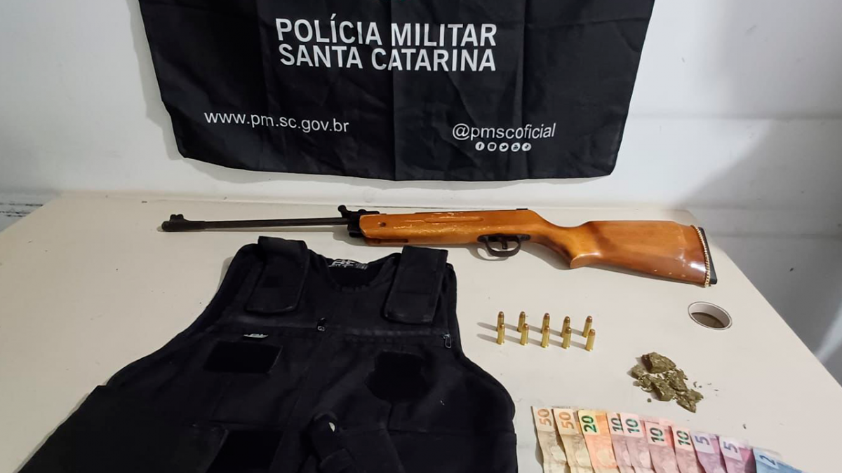 Além disso, uma pequena porção de maconha foi encontrada em cima da mesa na sala, a quantia de 172 reais em espécie e uma capa de colete balístico.