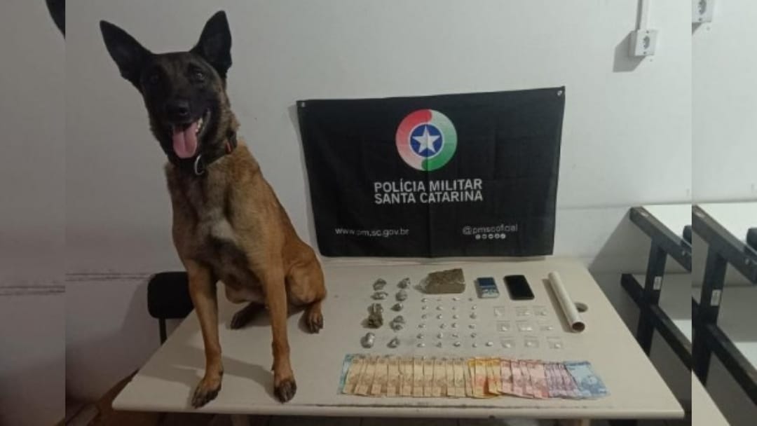 Com apoio do do canil do Décimo Nono Batalhão, com o uso do cão de faro Argo no interior da residência, localizou 350 gramas de maconha, 12,7 gramas de crack, e 6,3 gramas de cocaína.