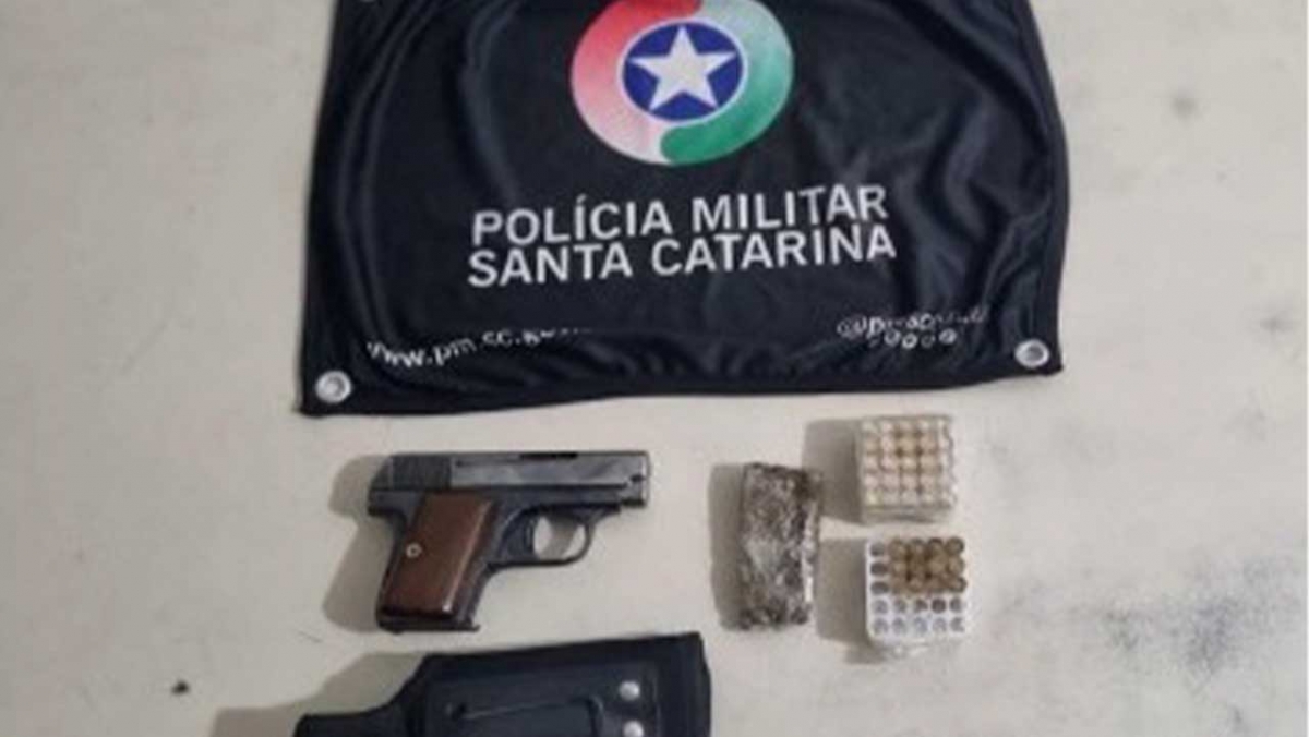 No interior do veículo foi abordado um homem de 36 anos, e com ele foi encontrado uma pistola Herstal, calibre 6.35mm modelo 1906, com um estojo contendo 37 munições do mesmo calibre e 18,9g de maconha.