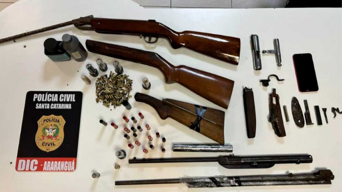 No local onde o homem foi preso, havia uma espingarda desmontada, munições de vários calibres, e equipamentos utilizados para o conserto.