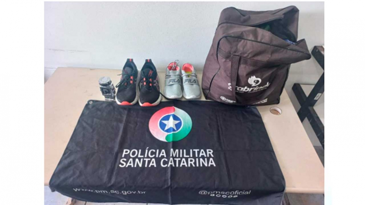 O autor, de 42 anos, saiu pela lateral do estabelecimento, e furtou de dentro do veículo da vítima dois pares de tênis, um perfume e uma bolsa com roupas, colocou os pertences dentro de um saco de latas e saiu do local.