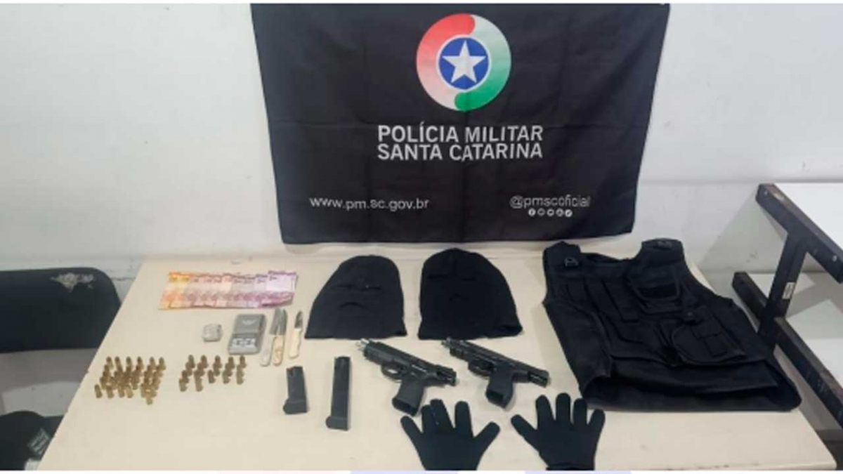 Durante as buscas no quintal, foram localizadas duas armas escondidas no muro, uma pistola calibre 9mm com 31 munições e um carregador prolongado, e uma pistola calibre .40 com 17 munições.