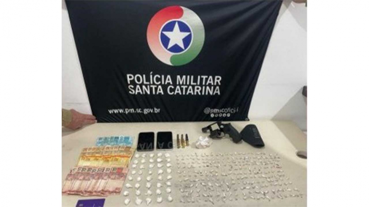 Após ser abordado, em sua casa foi localizado um revólver, munição, cerca de 76,20 gramas de crack, 42,12 gramas de cocaína, além de dois celulares e R$ 1.090,00.