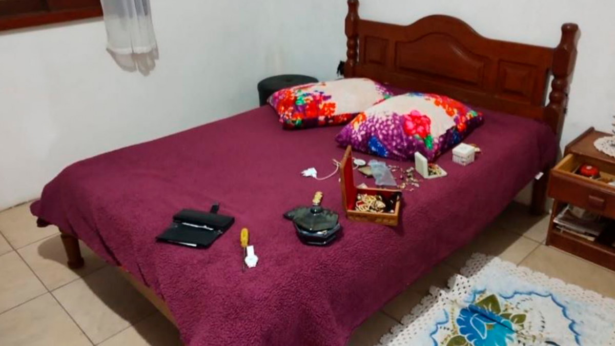 A guarnição entrou na residência, e localizou o criminoso escondido no banheiro da casa. De pronto, os policiais militares deram voz de prisão ao suspeito do crime. No quarto da vítima, haviam vários itens como joias, semijoias, relógios, e peças de roupas espalhadas sob a cama do quarto.
