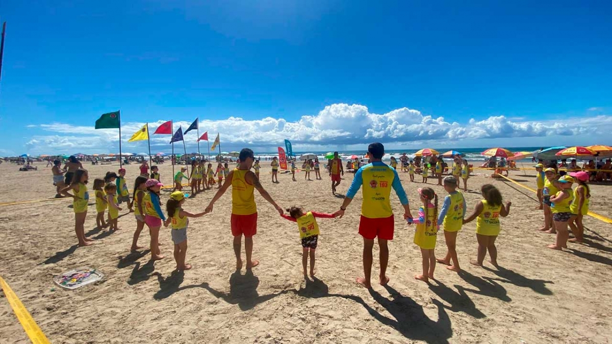 Todo ano é um sucesso. As crianças que frequentam a praia que mais cresce em Santa Catarina já sabem que no verão tem Projeto Golfinho. A iniciativa é do Corpo de Bombeiros Militar de SC, CBMSC.