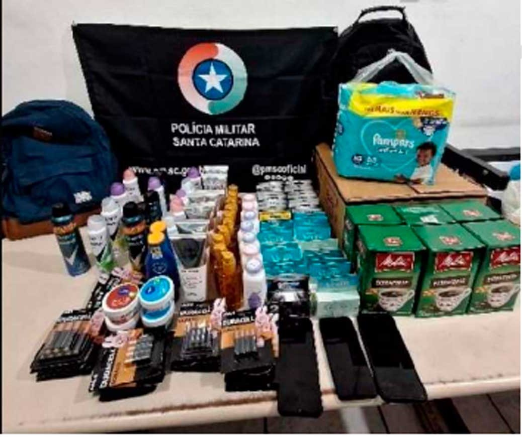 Os produtos furtados pelos homens estavam ensacados em sacos de lixo, no porta-malas do carro. Os itens recuperados foram 219 desodorantes aerossóis, 106 kits de pilhas, 77 protetores solares, 35 Gillettes e 25 produtos de higiene pessoal.