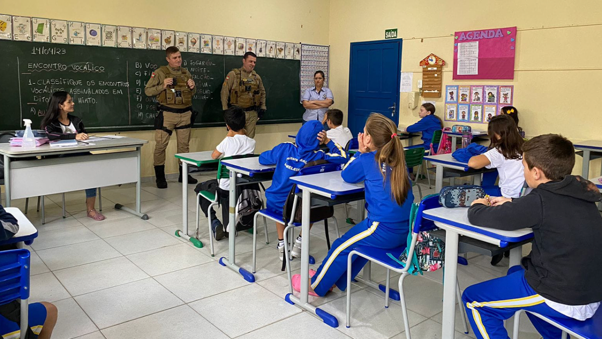 Na manhã de segunda-feira, 17, os policiais militares, Cabo Magahim e o Cabo Nicolete, estiveram na EEBM.Prefeito Luiz De Pelegrini estiveram reunidos com os alunos do 5º ano, falando sobre o Programa de segurança que está acontecendo nas escolas.