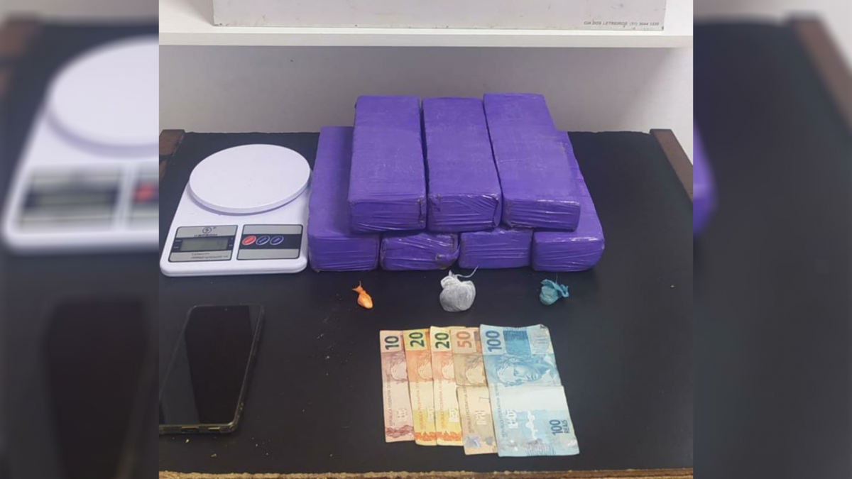 Identificou-se que o homem abordado possui 38 anos e apresenta registros anteriores por tráfico e posse de substâncias ilícitas. Durante a ação, os policiais apreenderam sete tijolos de maconha, totalizando aproximadamente 4,5 quilogramas, além de uma pequena porção da mesma substância, uma pedra de crack, uma quantidade de cocaína, uma balança de precisão, um celular e R0,00 em espécie.