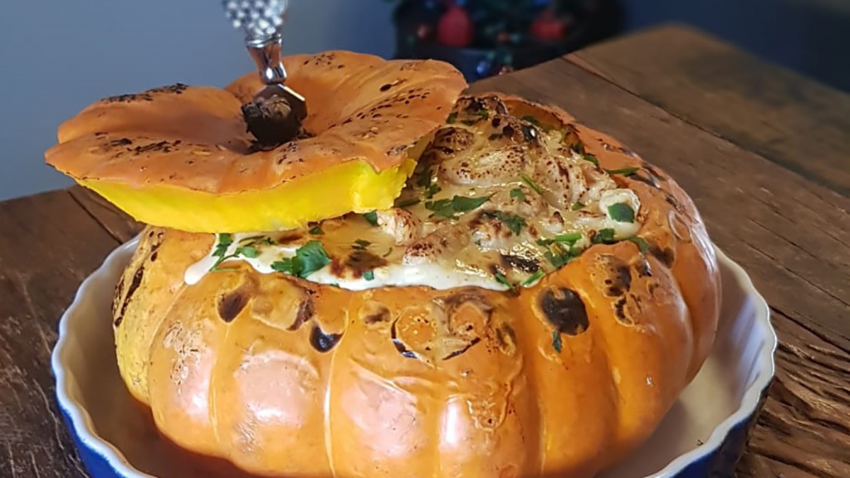 Ceia de natal remete a fartura e comidas festivas. Onde entra o frango então? A proteína é uma das mais usadas no dia a dia e, portanto, não combina com comida de festa. Errado! O franguinho nosso de cada dia sabe se vestir de gala e roubar a cena do baile. Preparado com damasco e requeijão e servido na moranga, é coroado rei da festa e fica chique, além de em conta! A receita preparada pelo chef Melchior Neto é uma opção fantástica para brilhar sem gastar muito.