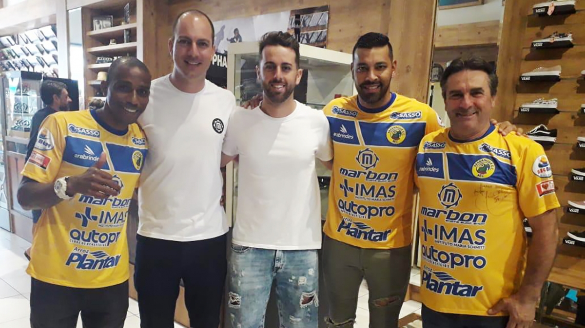 O empresário Maurício Bom recebeu, no último sábado, na Marbon Skate Surf Shop a visita ilustre dos craques André Santos e Carlos Alberto. Na foto com o empresário e os craques estão Filippe Sasso Presidente do AEC e seu pai José Hilson.