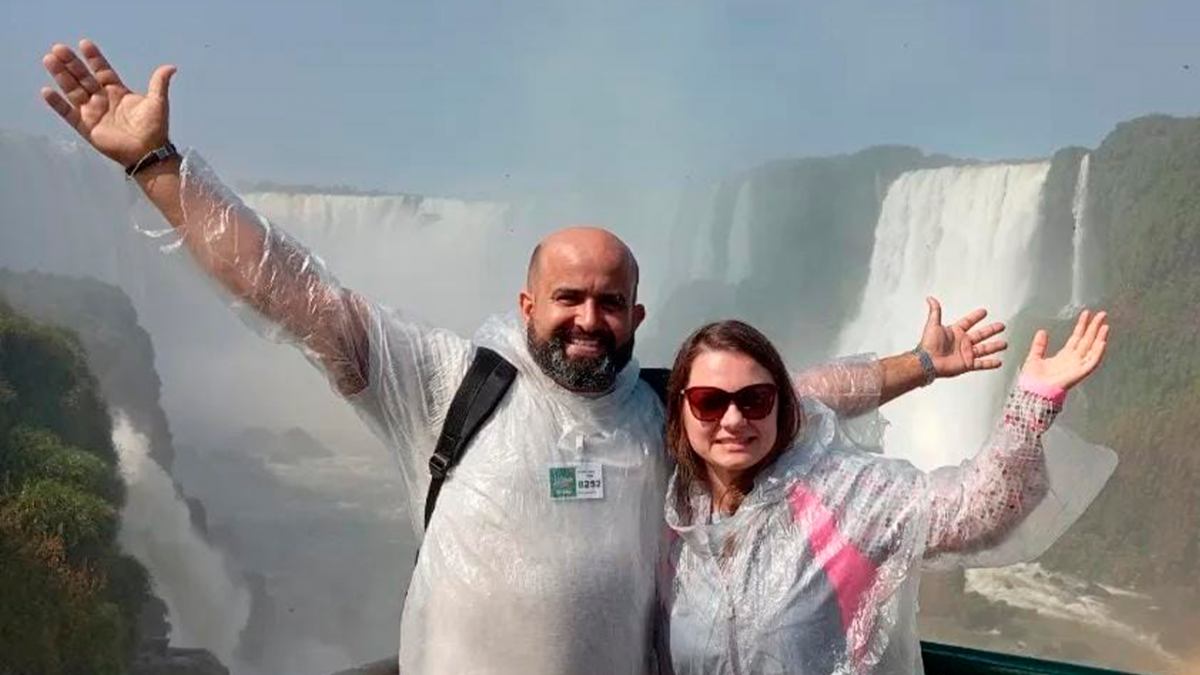 Alessandro Nunes e a esposa Aline Baldessar em clic nas Cataratas do Iguaçu.